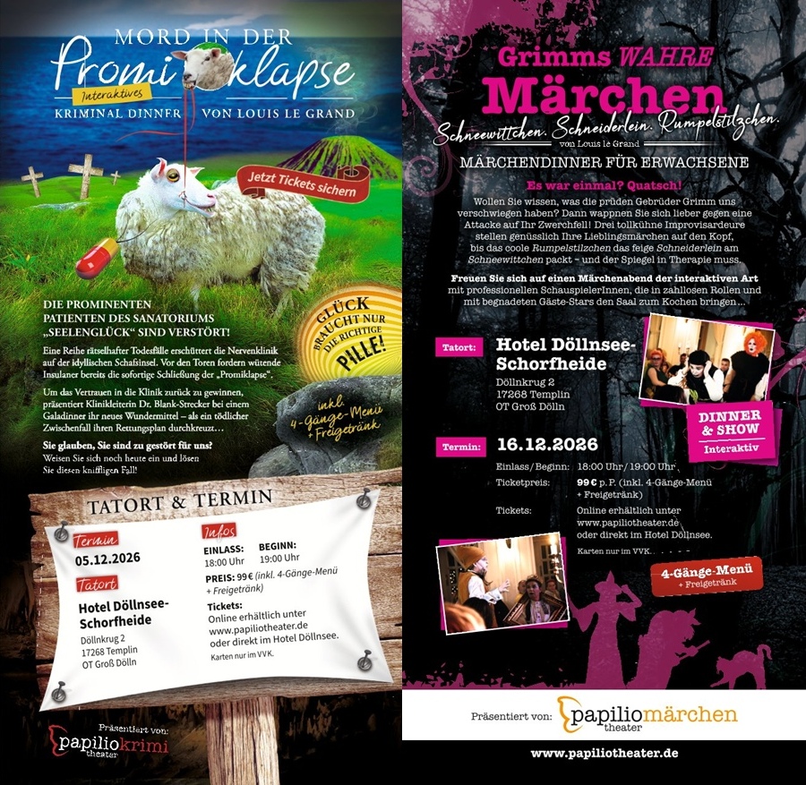 Für Fragen zu unserem Krimi-/Märchendinner erreichen Sie uns unter der Rufnummer 039882 - 630. Mehr Infos zu den Stücken finden Sie auf www.papiliotheater.de.